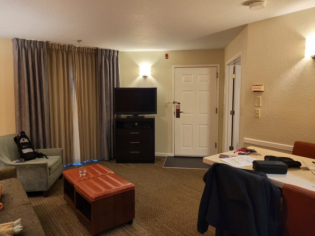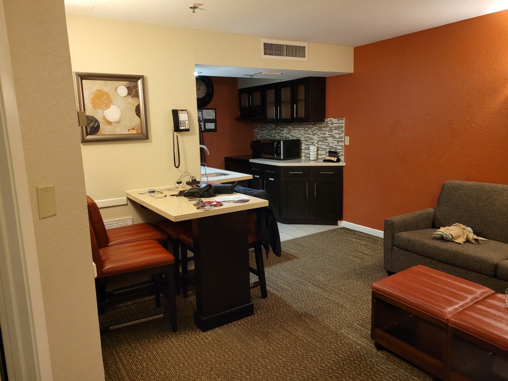 Rental car issues resolved and ready to get settled, we hopped in the vehicle and made way to the hotel. As I mentioned earlier, Florida was living up to its reputation of only two types of weather – hot as Hell or hurricanes. And compared to the chilly Autumn weather we experienced just mere hours earlier, it felt like we took a two-month step back into heat and humidity. Of course, just days earlier, Hurricane Ian decided to make landfall and cross over just a stone’s throw from Orlando. The road signs all the way to the hotel said the same thing – toll road fees were lifted due to the still receding flood waters, debris and damage…except we didn’t see any. Sure, there were some remaining pools of water here and there, but otherwise, it looked like they got a little rain and that was it. By comparison, the DC area shuts down for days if we get even just the bare edge of a hurricane going up the coast.