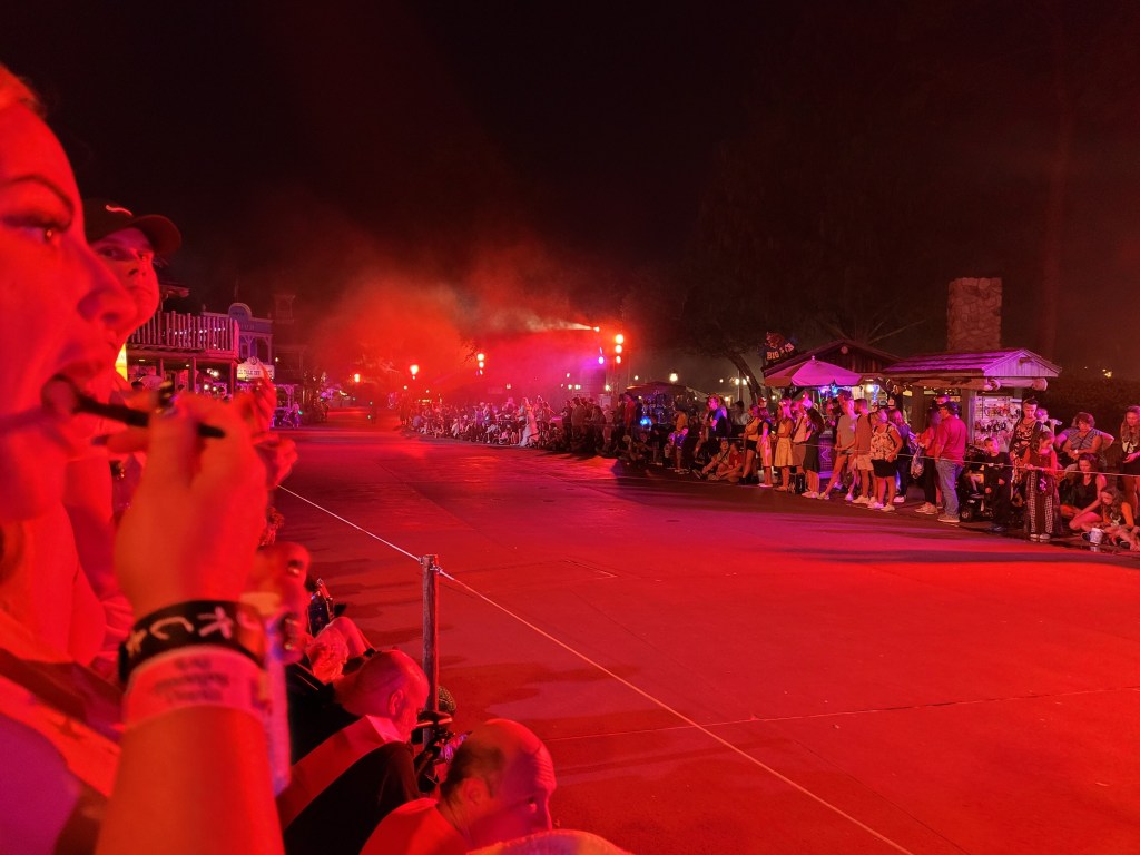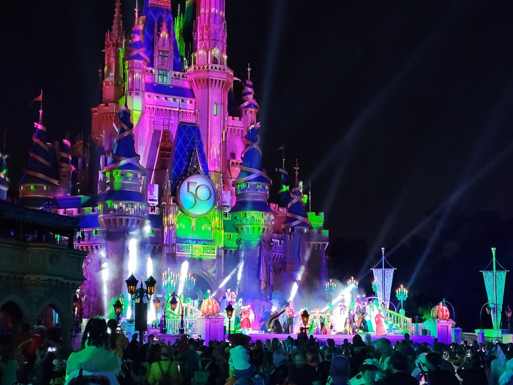 By the time we finished with the rides, it was dark and showtime for the parade was heralded by the staff ushering people from side to side as they set up the rope lines and encouraged everyone to find a good spot. Our wandering around took us back by the castle again, where a big Halloween-themed stage show was in full tilt. The castle was lit up to be all spooky, and every villain from a Disney film was dancing and singing with near look-a-likes of the Sanderson Sisters from the recently released Hocus Pocus 2. Farrah loved the dancing, the costumed actors, the fireworks (which I managed to get a decent picture of), and the music. Say what you will, but Disney knows how to entertain.